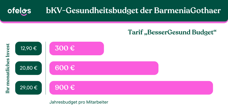 Beim „BesserGesund Budget“ wählen Arbeitgeber ein jährliches Gesundheitsbudget pro Mitarbeiter (zwischen 300 und 900 €), das dieser individuell für eine Vielzahl von Leistungen einsetzen kann. Der monatliche Beitrag pro Person liegt je nach gewählter Budgetstufe zwischen 12,90 € und 29,00 €.